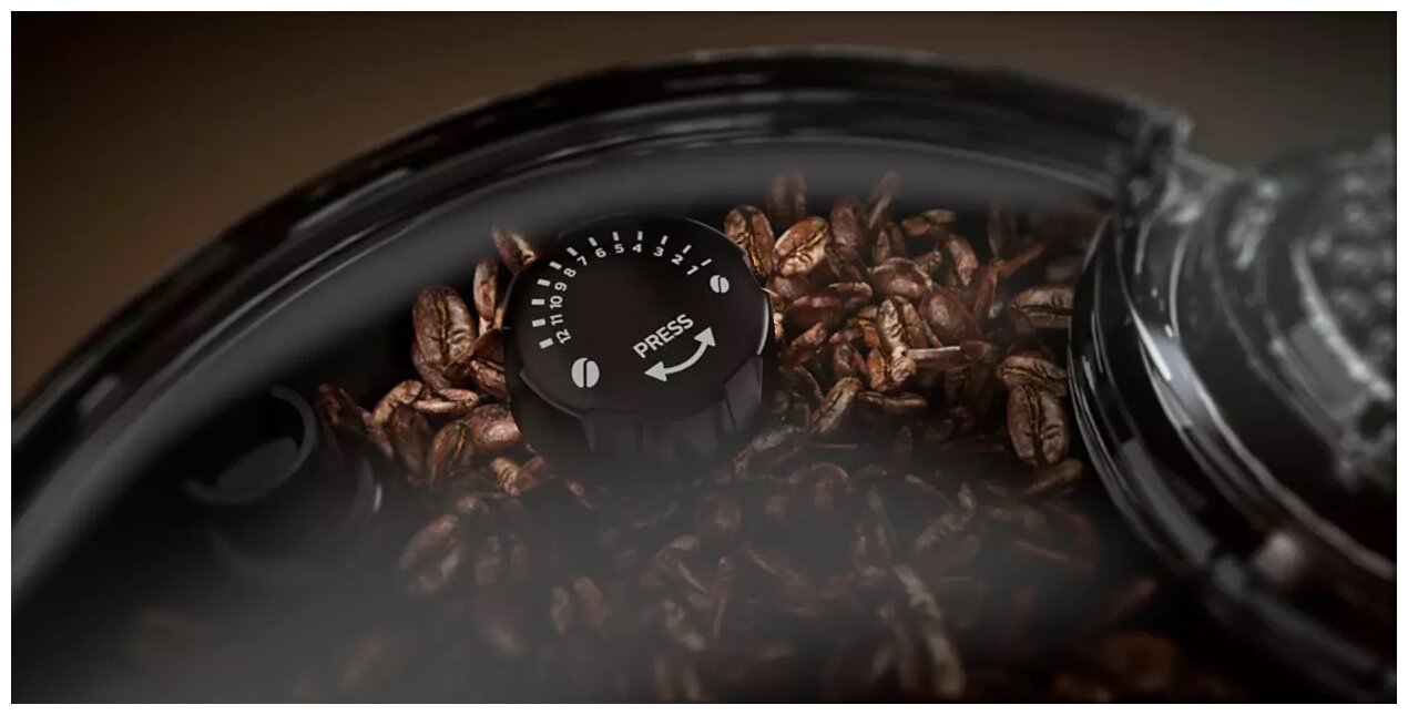 15 individual drinks; 12 grind levels; 6 profiles; 5 strength settings; waste container for 14 servings; automatic rinsing of coffee circulation elements; Standby mode; adjustable coffee dispenser 7