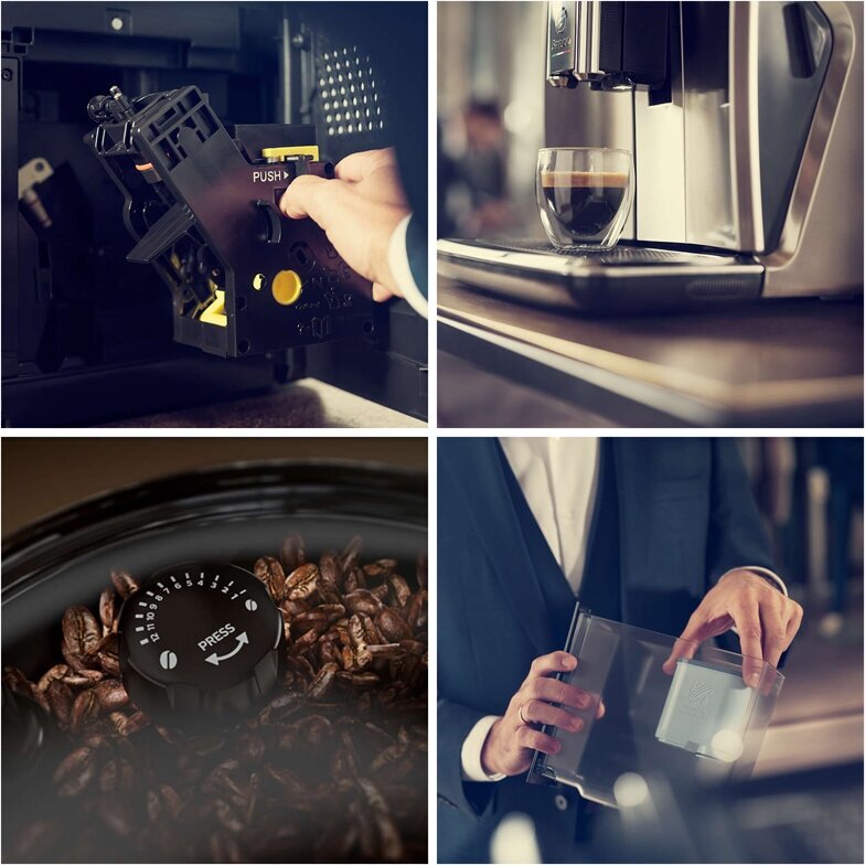 Automatic decalcification, auto shut-off when not in use, rapid steam, simultaneous preparation of two cups