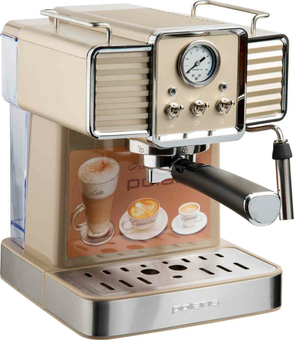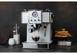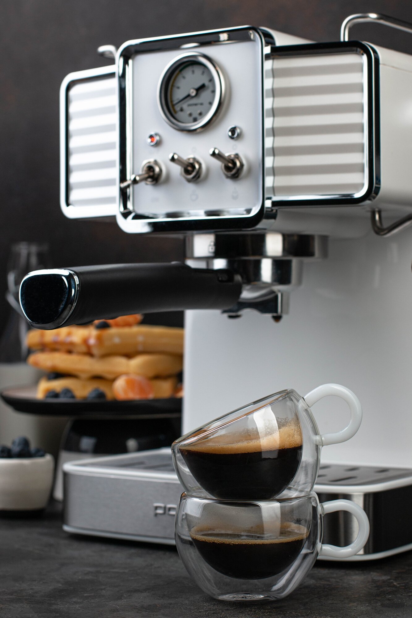 Auto shut-off when not in use, pressure gauge, simultaneous preparation of two cups, cup heating