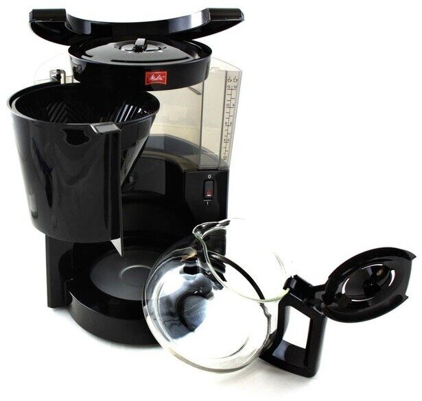 Rotating filter holder, power indicator, water level indicator, cord compartment, automatic heating plate