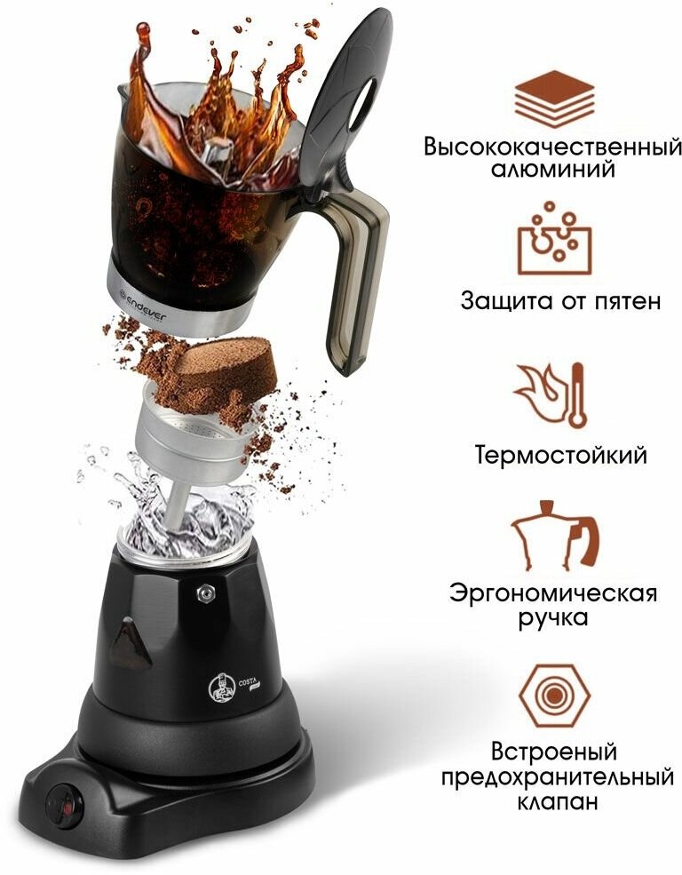 Device type: coffee maker, type: geyser, type of coffee used: ground, type of drink: Americano, espresso, volume: 0.30 l, design features: power indicator, 360° stand rotation, readiness indicator