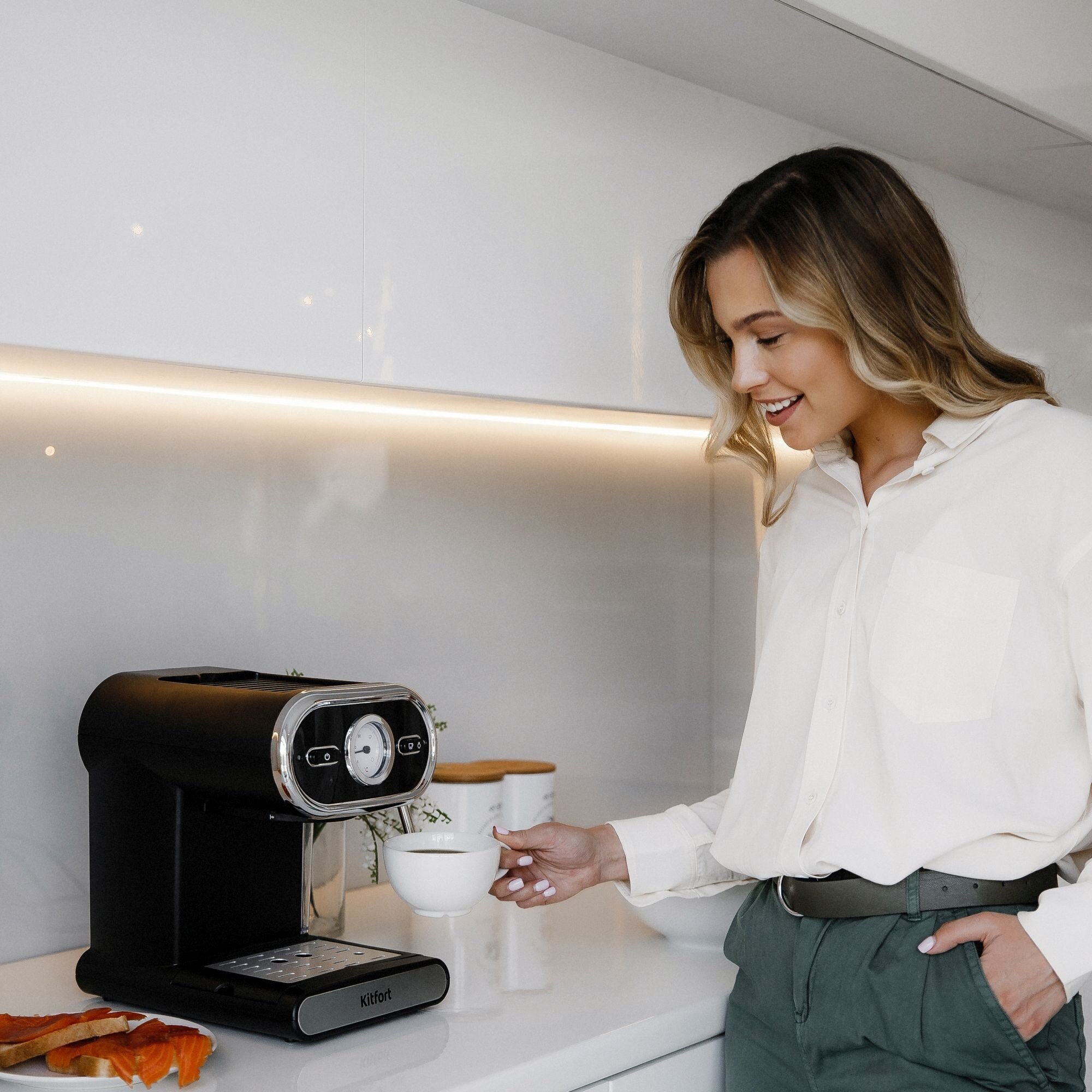 Automatic shutdown after preparing a drink, simultaneous preparation of two cups, hot water supply, cup heating