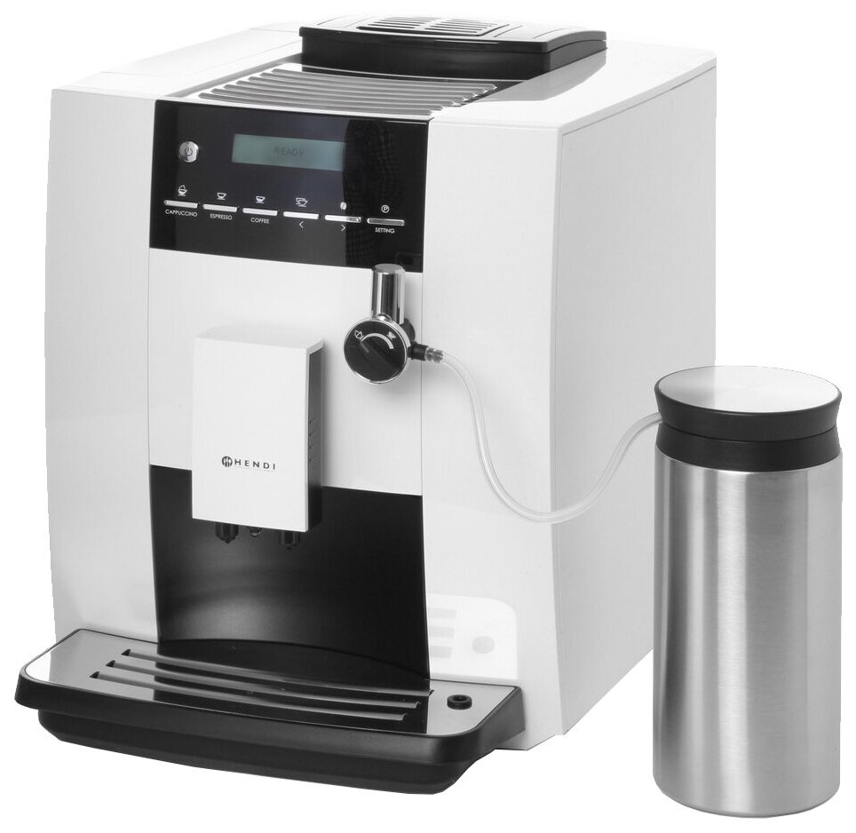 Milk container with a volume of 600 ml; regulation of steam supply duration: 3-120 s; container for coffee grounds for 15 servings; prepared drinks counter