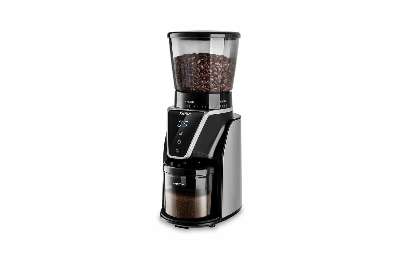 Contents: 1. Coffee grinder: • Motor block - 1 pc. • Container for grains - 1 pc. • Cover of the container for grains - 1 pc. • Container for ground coffee - 1 pc. • Container lid for ground coffee - 1 pc. • Upper millstone
