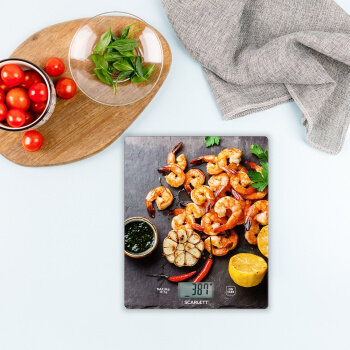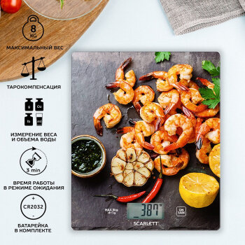 Type: Kitchen scales, design: platform, weighing limit: 8 kg, measurement accuracy: 1 g, additional functions: liquid volume measurement, tare compensation, indication: overload