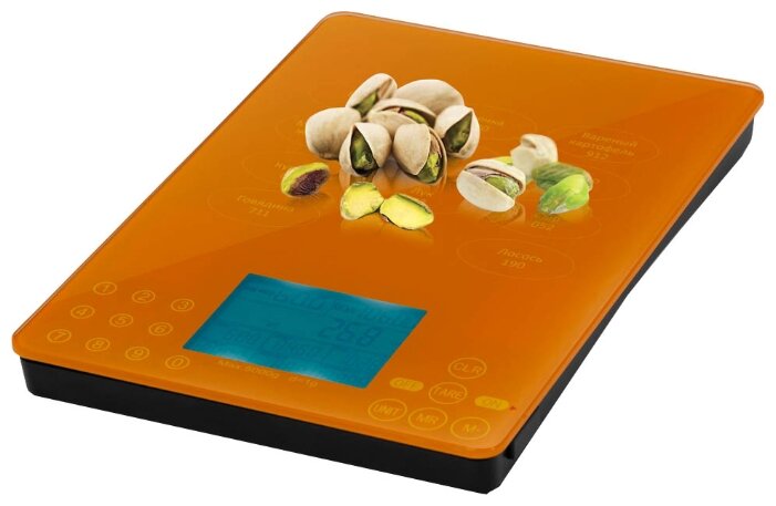 Type: electronic, design: platform, weighing limit: 3 kg, measurement accuracy: 1 g, additional functions: automatic shutdown, calorie counter, tare compensation, indication: battery charge, overload
