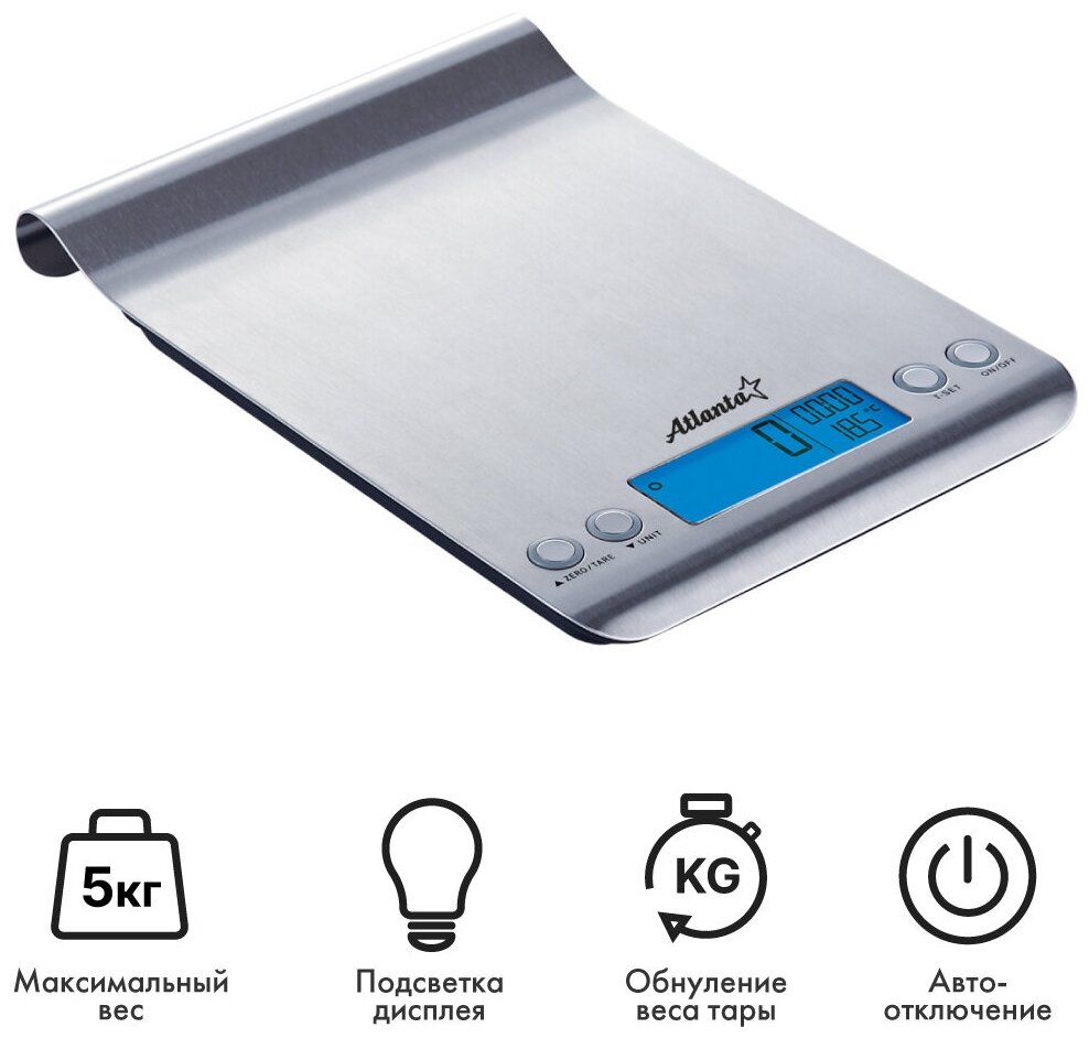 Type: electronic, design: platform, weighing limit: 8 kg, measurement accuracy: 1 g, additional functions: automatic shutdown, liquid volume measurement, tare compensation, indication: battery charge, switch
