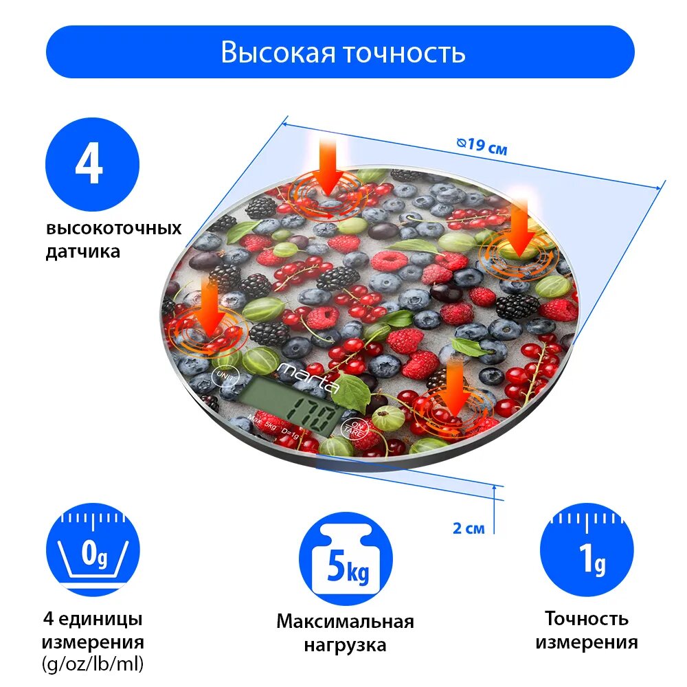 Type: electronic, design: platform, weighing limit: 8 kg, measurement accuracy: 1 g, additional functions: automatic shutdown, liquid volume measurement, tare compensation, indication: battery charge, switch
