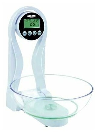 Type: electronic, design: bowl, weighing limit: 3 kg, measurement accuracy: 1 g, additional functions: sequential weighing, timer, tare compensation, clock, design features: possibility of mounting