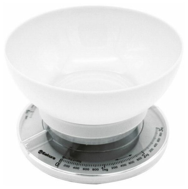 Type: mechanical, design: bowl, weighing limit: 3 kg, measurement accuracy: 40 g, design features: removable platform/bowl