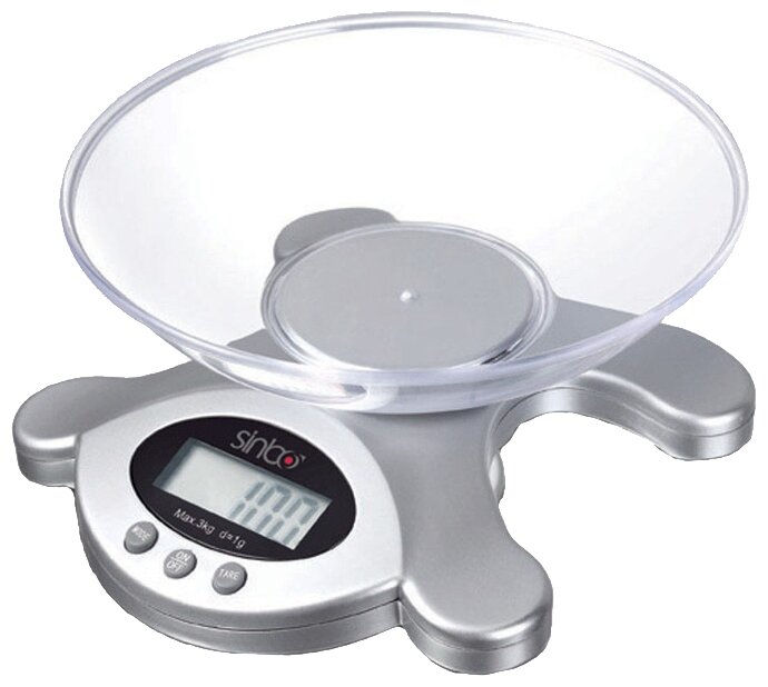 Type: electronic, design: bowl, weighing limit: 3 kg, measurement accuracy: 1 g, additional functions: automatic shutdown, tare compensation, indication: battery charge, overload