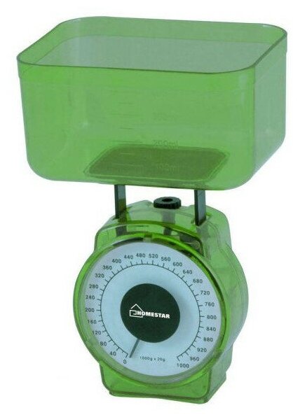 Type: mechanical, design: bowl, weighing limit: 1 kg, measurement accuracy: 20 g, additional functions: liquid volume measurement