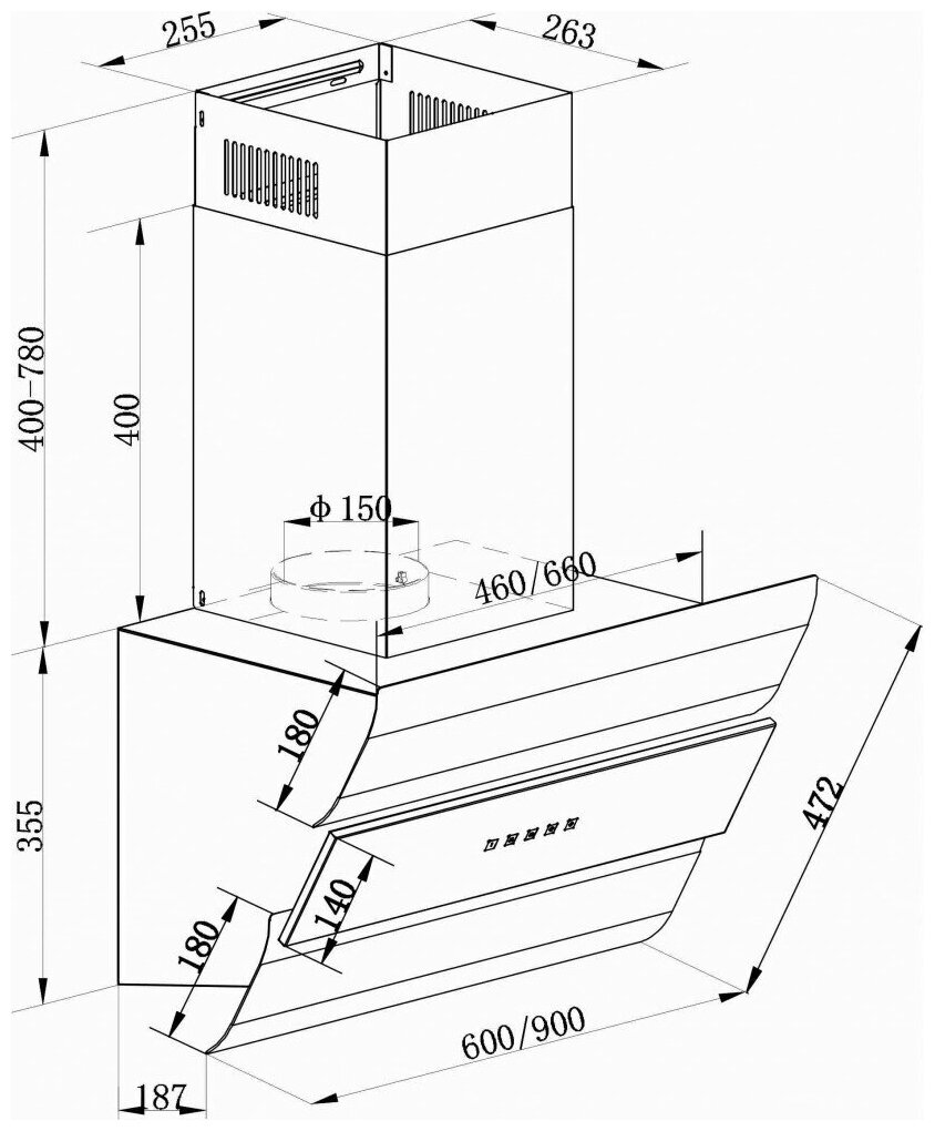 Form factor: inclined, width: 90 cm, operating modes: exhaust / circulation, maximum productivity: 850 m³/hour, installation type: wall-mounted, filter: grease + carbon, control type: electronic, lighting type: LED