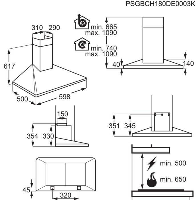 Form factor: dome, operating modes: exhaust / circulation, maximum productivity: 500 m³/hour, installation type: wall-mounted, lighting type: halogen lamp, installation width: 90 cm, additional functions: intensive