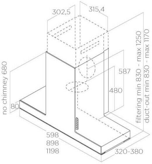 Form factor: T-shaped, width: 120 cm, depth: 32 cm, operating modes: exhaust, maximum productivity: 1200 m³/hour, filter: grease, control type: electronic, lighting type: LED, maximum noise level: 5