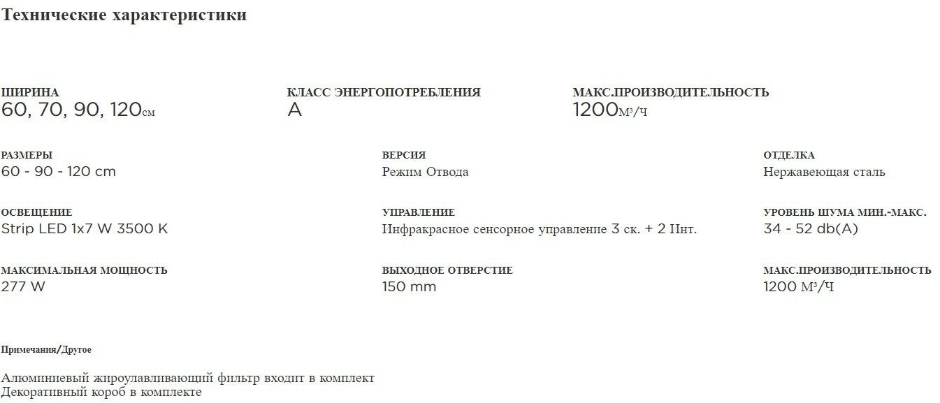 Description: Form factor: T-shaped, width: 60 cm, depth: 42 cm, operating modes: exhaust, maximum productivity: 1200 m³/hour, filter: grease, control type: electronic, lighting type: LED, maximum noise level: 54