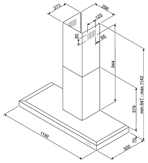 Form factor: dome, width: 119.80 cm, depth: 50 cm, operating modes: exhaust / circulation, maximum productivity: 800 m³/hour, installation type: wall-mounted, filter: grease, control type: electronic, lighting type: LED