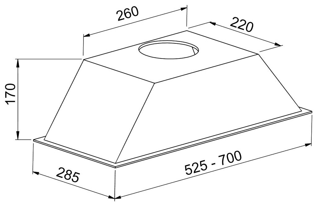 Form factor: built-in, width: 52 cm, depth: 28.50 cm, operating modes: drain / circulation, installation location: in a cabinet, maximum productivity: 850 m³/hour, filter: grease, control type: mechanical, lighting type