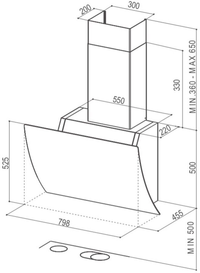 Form factor: inclined, width: 80 cm, depth: 46 cm, operating modes: exhaust / circulation, maximum productivity: 580 m³/hour, filter: grease, control type: mechanical, lighting type: LED, maximum level