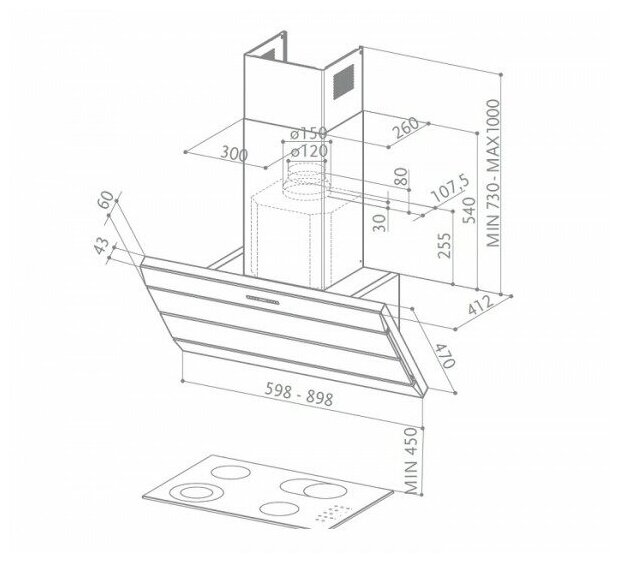 Form factor: dome, operating modes: exhaust / circulation, maximum productivity: 500 m³/hour, installation type: wall-mounted, lighting type: halogen lamp, installation width: 90 cm, additional functions: intensive