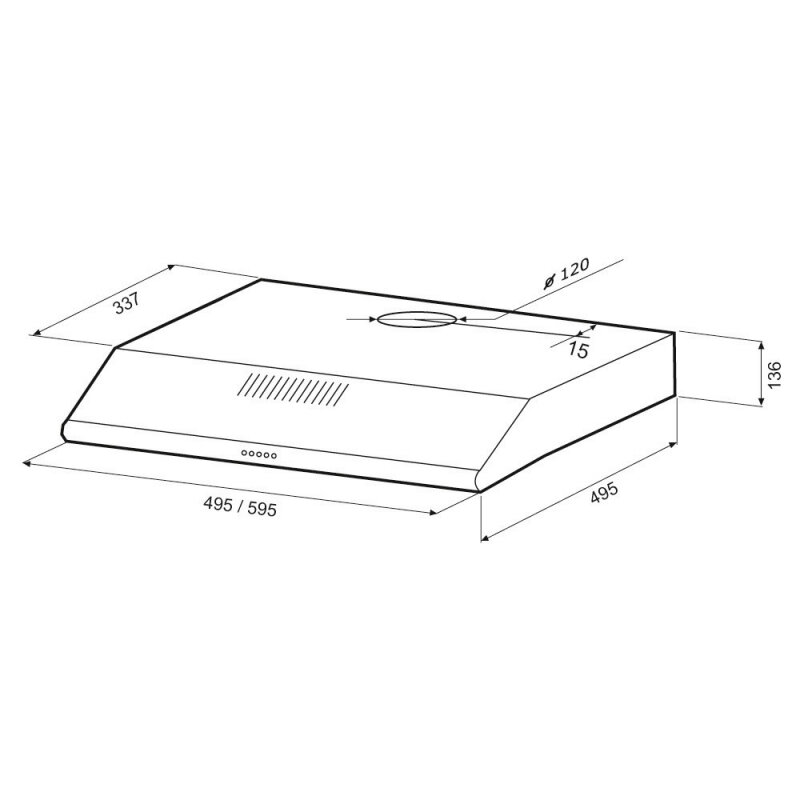 Form factor: flat, width: 60 cm, depth: 50 cm, operating modes: drain / circulation, installation location: in a cabinet, maximum productivity: 507 m³/hour, filter: grease, control type: mechanical, lighting type: lamp