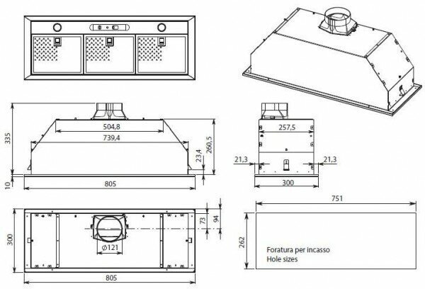 Form factor: built-in, width: 80.50 cm, depth: 30 cm, operating modes: drain / circulation, installation location: in a cabinet, maximum productivity: 960 m³/hour, filter: grease, control type: mechanical, lighting type