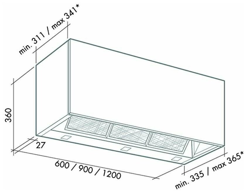 Operating modes: exhaust / circulation, maximum productivity: 600 m³/hour, filter: grease, type of lighting: incandescent lamp, maximum noise level: 58 dB