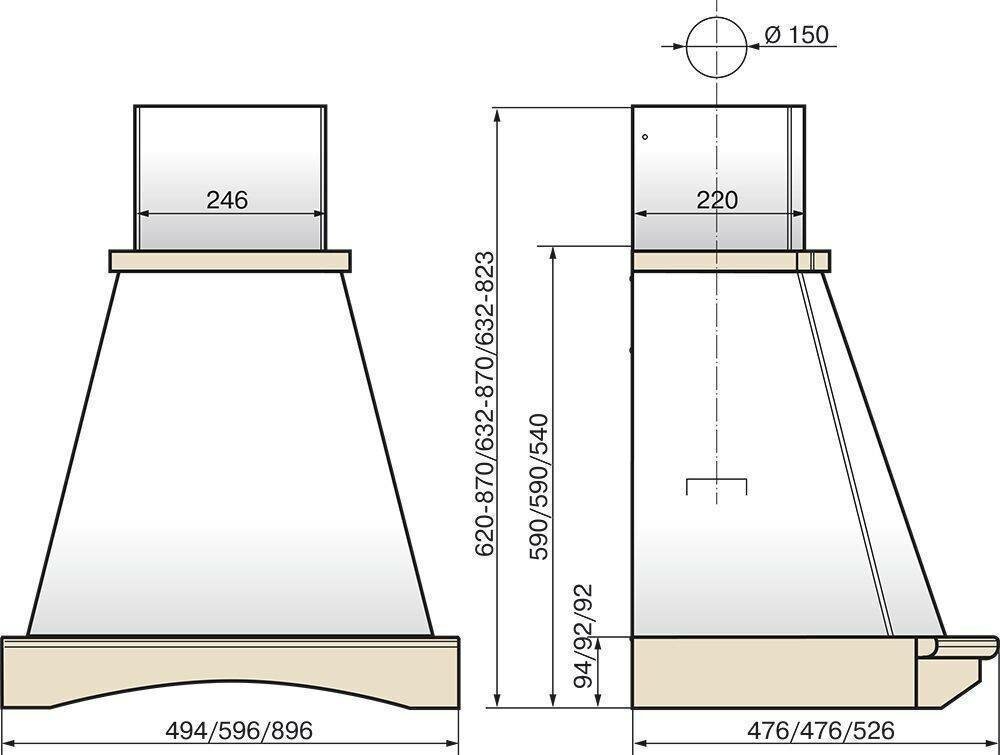 Description: Form factor: dome, width: 60 cm, depth: 48 cm, operating modes: exhaust / circulation, maximum productivity: 650 m³/hour, installation type: wall-mounted, filter: grease, control type: mechanical, lighting type: gal