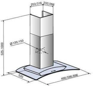 Width: 60 cm, depth: 59.60 cm, operating modes: outlet, maximum productivity: 430 m³/hour, lighting type: LED