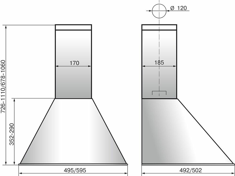 Form factor: dome, width: 59.50 cm, depth: 50.20 cm, operating modes: exhaust / circulation, maximum productivity: 430 m³/hour, installation type: wall-mounted, filter: grease, control type: electronic, lighting type: s