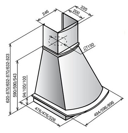 Form factor: dome, operating modes: exhaust / circulation, maximum productivity: 500 m³/hour, installation type: wall-mounted, lighting type: halogen lamp, installation width: 90 cm, additional functions: intensive