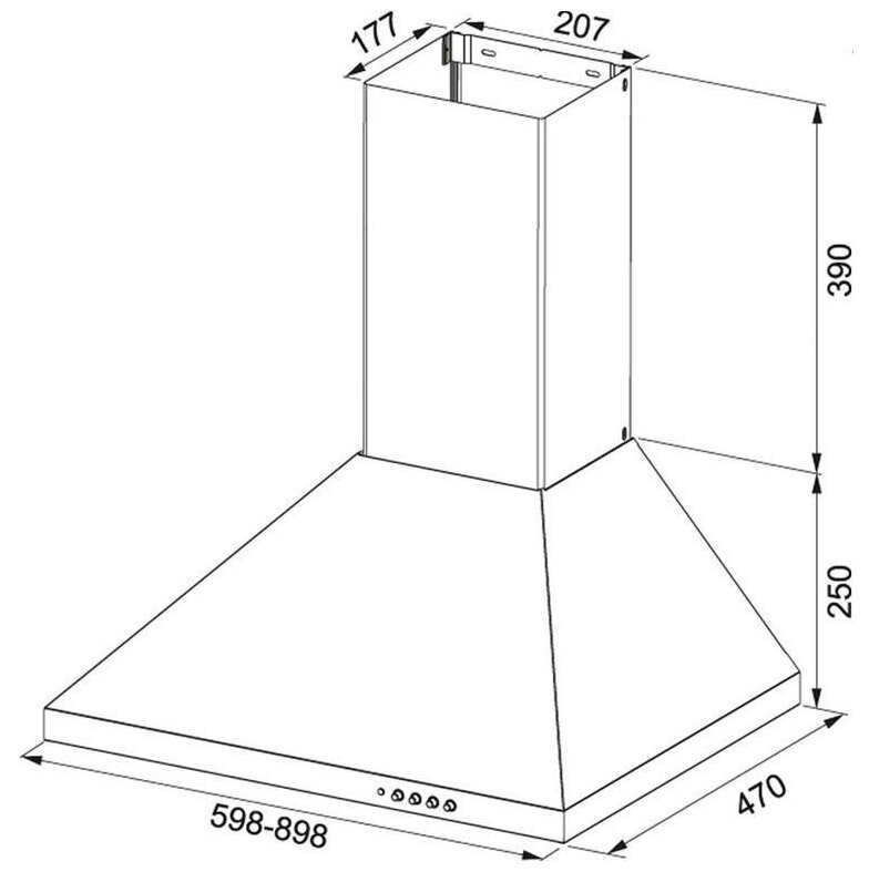 Form factor: dome, width: 60 cm, depth: 47 cm, operating modes: exhaust / circulation, maximum productivity: 380 m³/hour, installation type: wall-mounted, filter: grease, control type: mechanical, lighting type: light