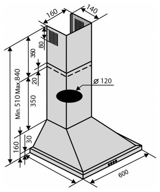 Form factor: dome, width: 60 cm, operating modes: exhaust / circulation, maximum productivity: 450 m³/hour, installation type: wall-mounted, filter: grease, control type: mechanical, lighting type: incandescent