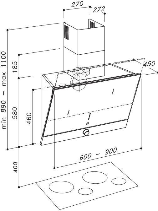 Form factor: inclined, width: 90 cm, depth: 43 cm, operating modes: exhaust / circulation, maximum productivity: 800 m³/hour, installation type: wall-mounted, filter: grease, control type: electronic, lighting type: light