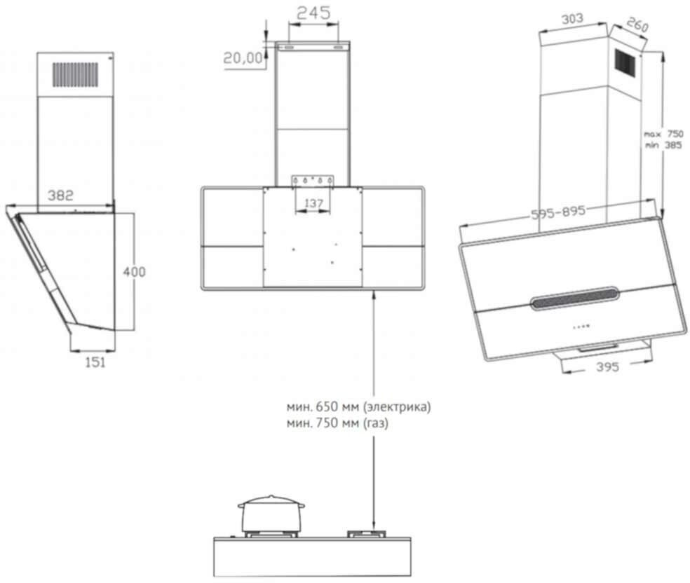Form factor: dome, operating modes: exhaust / circulation, maximum productivity: 500 m³/hour, installation type: wall-mounted, lighting type: halogen lamp, installation width: 90 cm, additional functions: intensive