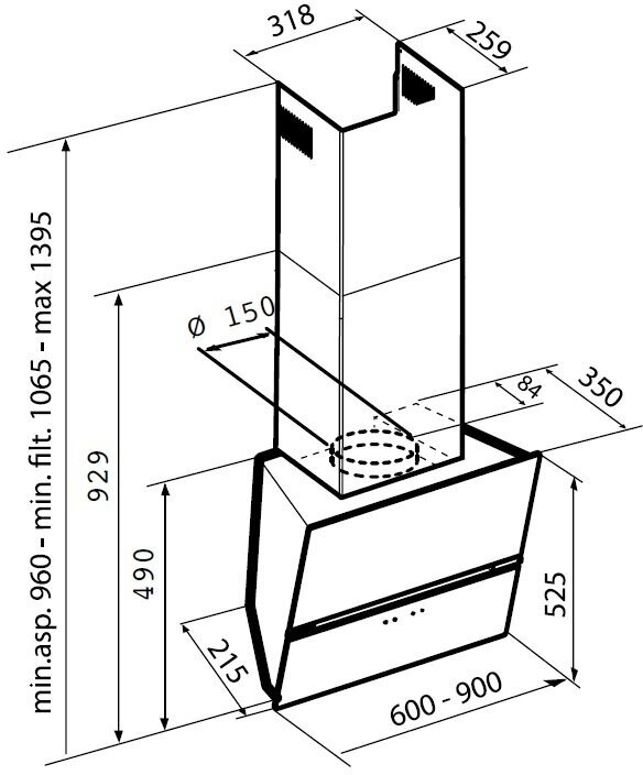 Form factor: inclined, width: 60 cm, depth: 34 cm, operating modes: exhaust / circulation, maximum productivity: 950 m³/hour, installation type: wall-mounted, filter: grease, control type: electronic, lighting type: halo