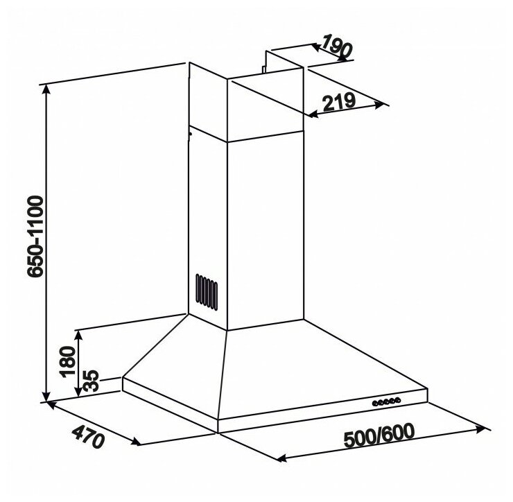 Description: Form factor: dome, width: 50 cm, depth: 47 cm, operating modes: exhaust / circulation, maximum productivity: 700 m³/hour, installation type: wall-mounted, filter: grease, control type: mechanical, lighting type: gal