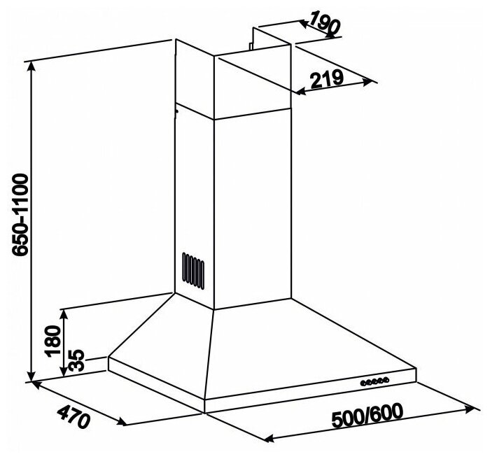 Form factor: dome, width: 60 cm, depth: 47 cm, operating modes: exhaust / circulation, maximum productivity: 700 m³/hour, installation type: wall-mounted, filter: grease, control type: mechanical, lighting type: gal