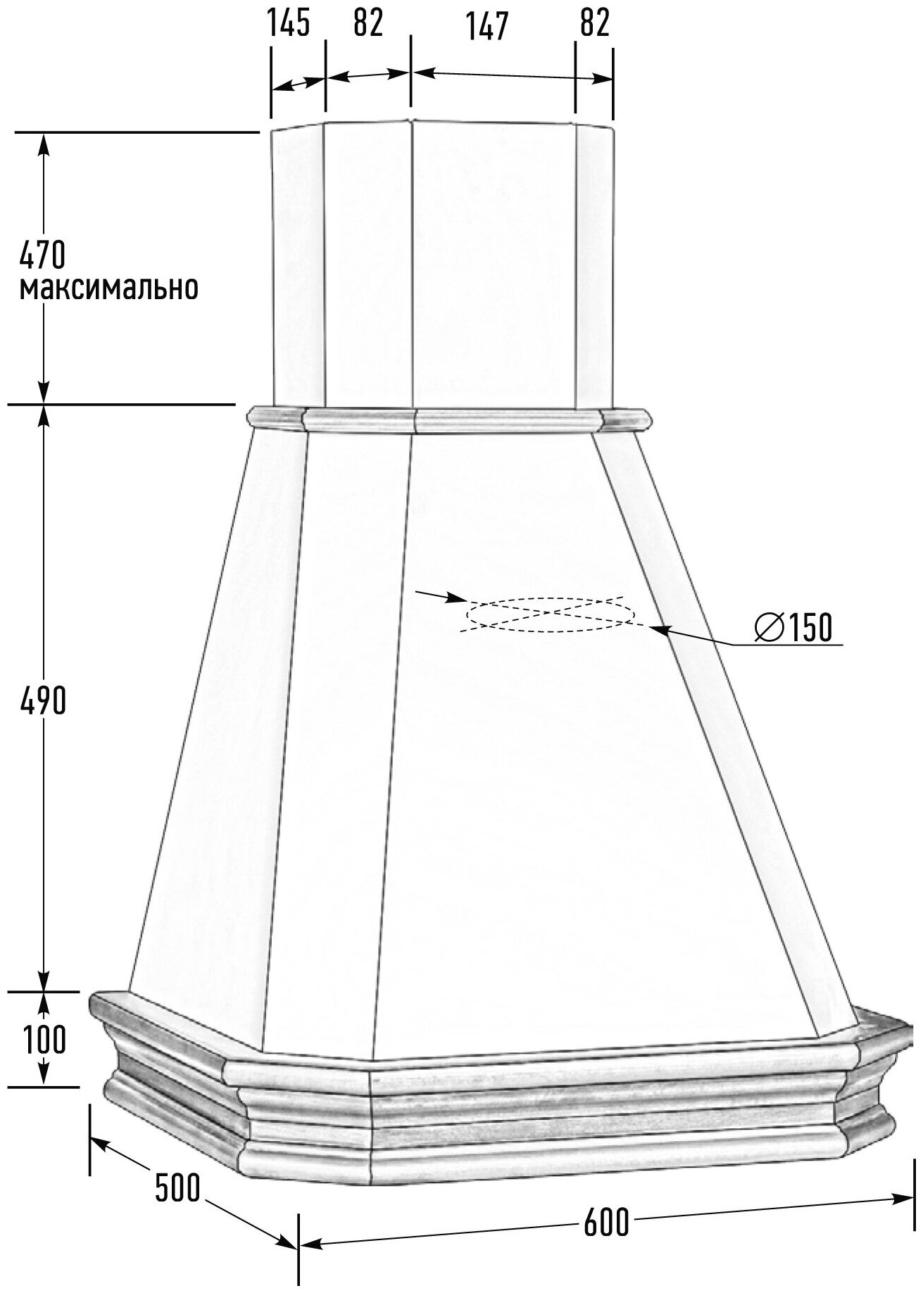 Form factor: dome, operating modes: exhaust / circulation, maximum productivity: 500 m³/hour, installation type: wall-mounted, lighting type: halogen lamp, installation width: 90 cm, additional functions: intensive
