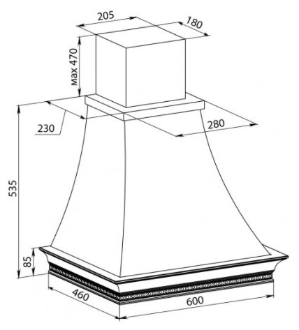 Description: Form factor: dome, width: 60 cm, depth: 46 cm, operating modes: exhaust / circulation, maximum productivity: 900 m³/hour, installation type: wall-mounted, filter: grease, control type: mechanical, lighting type: gal