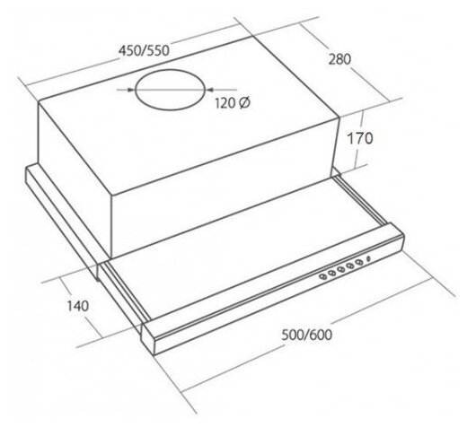 Width: 60 cm, operating modes: exhaust / circulation, maximum capacity: 870 m³/hour, control type: mechanical, lighting type: LED, maximum noise level: 48 dB, duct diameter: 120 mm