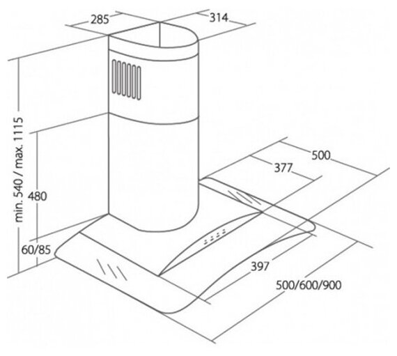 Width: 50 cm, operating modes: exhaust / circulation, maximum productivity: 850 m³/hour, installation type: wall-mounted, control type: mechanical, lighting type: LED, maximum noise level: 52 dB, diameter pa