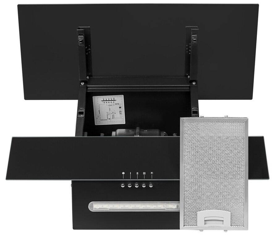 Form factor: inclined, width: 60 cm, operating modes: exhaust / circulation, maximum productivity: 650 m³/hour, filter: grease, control type: mechanical, lighting type: LED