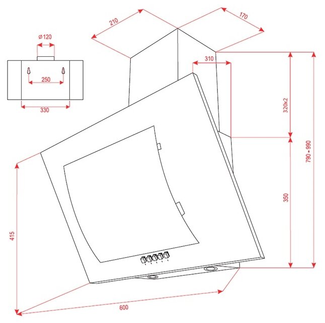 Form factor: inclined, width: 60 cm, depth: 35 cm, operating modes: exhaust / circulation, maximum productivity: 900 m³/hour, installation type: wall-mounted, filter: grease, control type: mechanical, lighting type: light
