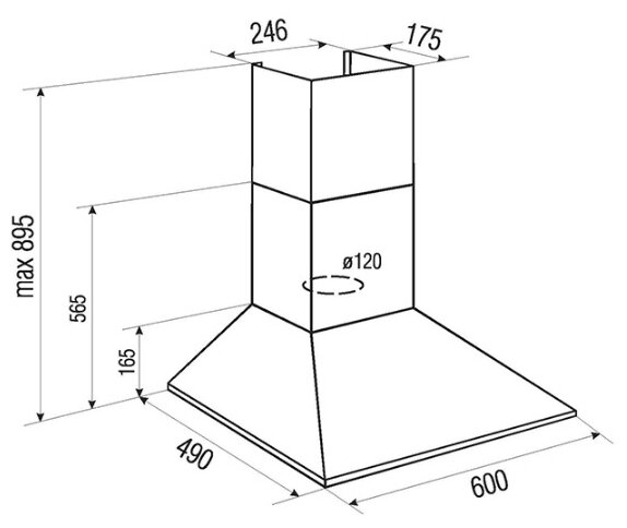 Form factor: dome, width: 60 cm, depth: 50 cm, operating modes: exhaust / circulation, maximum productivity: 600 m³/hour, installation type: wall-mounted, filter: grease, control type: mechanical, lighting type: laminated
