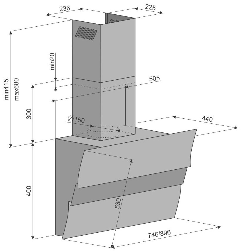Form factor: inclined, width: 89.60 cm, depth: 44 cm, operating modes: exhaust / circulation, maximum productivity: 1100 m³/hour, filter: grease, control type: electronic, lighting type: LED, maximum