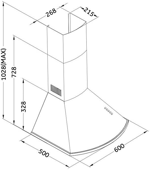 Description: Form factor: dome, width: 60 cm, depth: 50 cm, operating modes: exhaust / circulation, maximum productivity: 750 m³/hour, installation type: wall-mounted, filter: grease, control type: mechanical, lighting type: gal