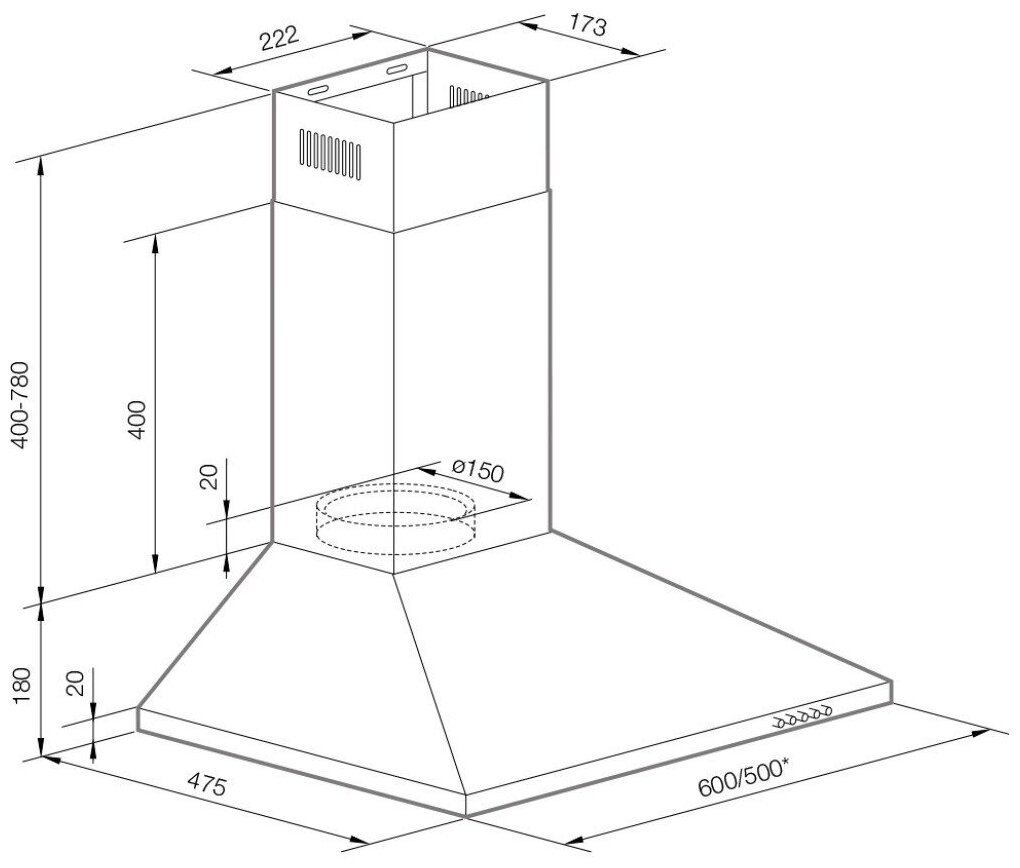 Form factor: dome, operating modes: exhaust / circulation, maximum productivity: 500 m³/hour, installation type: wall-mounted, lighting type: halogen lamp, installation width: 90 cm, additional functions: intensive