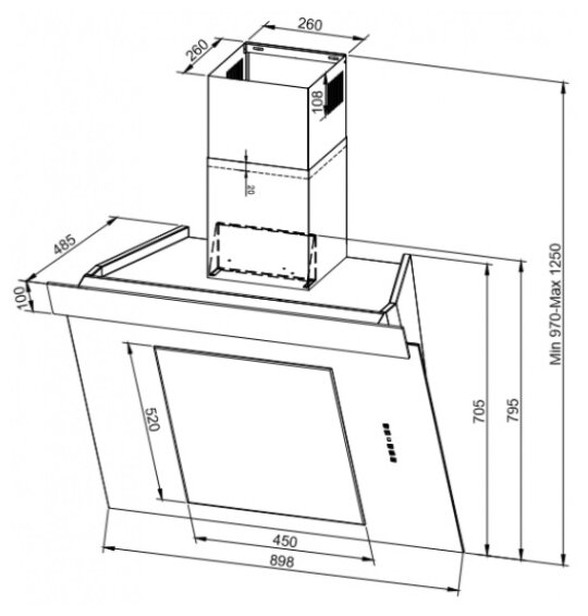 Form factor: inclined, width: 90 cm, depth: 48.50 cm, operating modes: drain / circulation, maximum productivity: 850 m³/hour, installation type: wall-mounted, filter: grease + carbon, control type: electronic, osc type