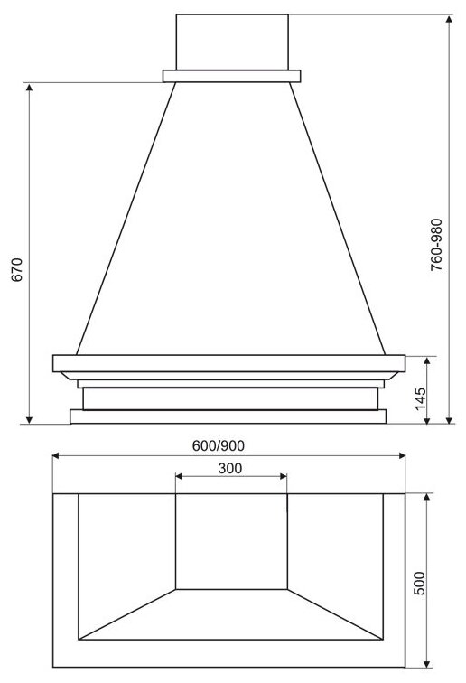 Form factor: dome, width: 90 cm, depth: 50 cm, operating modes: exhaust / circulation, maximum productivity: 450 m³/hour, installation type: wall-mounted, filter: grease, control type: mechanical, lighting type: laminated